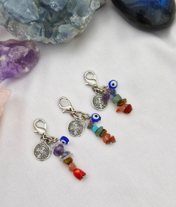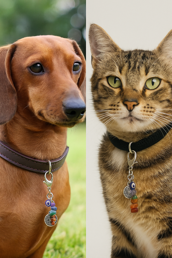 Este dije de piedras escallas de los 7 chakras, combinado con el ojo turco y la medalla de San Benito, actúa como un potente amuleto de protección energética para las mascotas. Las piedras equilibran las vibraciones de los chakras, ayudando a armonizar su campo áurico y mantener su energía vital en equilibrio. El ojo turco repele las malas intenciones, la envidia y las energías densas del entorno, mientras que San Benito refuerza el escudo espiritual, alejando toda influencia negativa o perturbadora. Juntos crean una frecuencia de luz, bienestar y resguardo, cuidando a los animales tanto en su cuerpo físico como en su plano sutil.