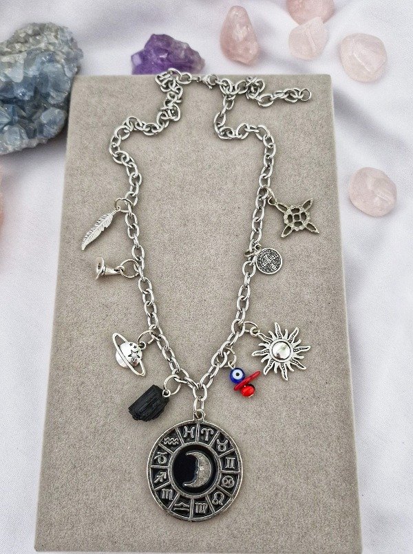 Collar “YO SOY EL QUE YO SOY” Una fusión de símbolos, fuerzas y arquetipos: el coral rojo protege y enraíza la energía vital; la semilla de huayruro aleja las malas vibras y atrae fortuna; el ojo turco vigila los caminos invisibles; el nudo de bruja sella los pactos con uno mismo; el sombrero de bruja representa la sabiduría de quien domina la energía sin pertenecer a ningún dogma. La medalla de San Benito invoca la luz ante la sombra, mientras la rueda del zodiaco recuerda que todo está escrito… y a la vez todo puede cambiar. El sol irradia poder y conciencia, la pluma simboliza libertad y liviandad espiritual, y Saturno marca el tiempo, la madurez y la estructura del destino.