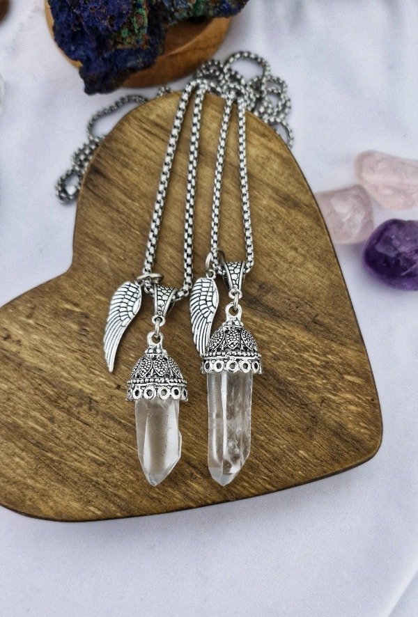 ● CUARZO CRISTAL ENGARZADO EN ZAMAK ARTESANAL Y CADENA DE ACERO 316L DE 60 CM