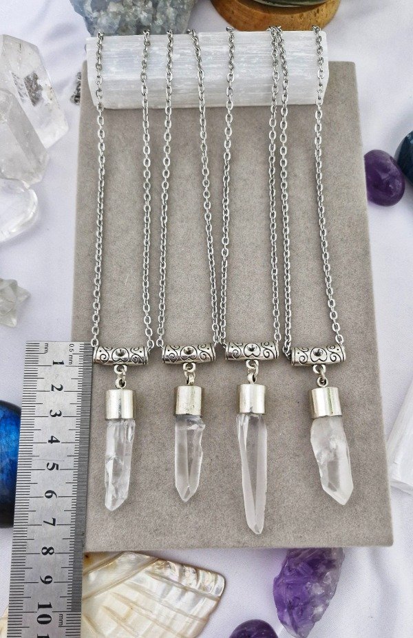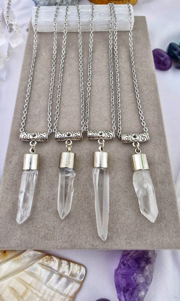 ● CUARZO CRISTAL ENGARZADO EN ZAMAK ARTESANAL Y CADENA DE ACERO 316L DE 50 CM